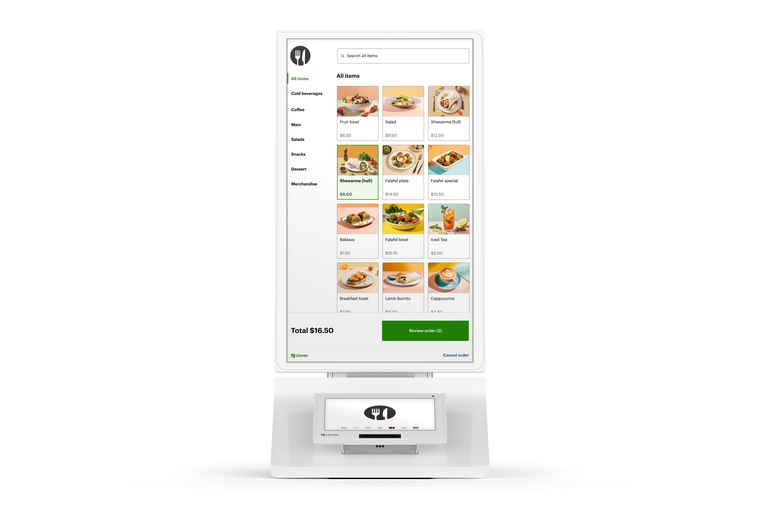 The Clover Kiosk connects to existing Clover hardware, like the Clover Mini and Station Duo, to help seamlessly run daily restaurant operations. The Kiosk allows for card and cash payments to make contactless ordering quick and simple.