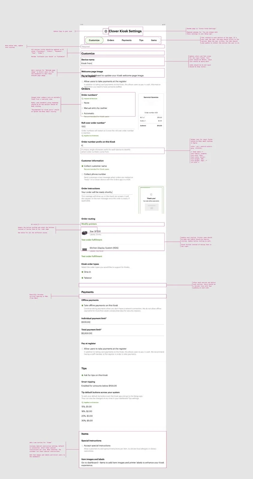 I led a user research sprint to gather ideas around how everyday users think about, and interact with, kiosks. I also looked back at existing research gathered by Clover to determine which parts of our ordering and checkout experience could remain the same. Once I had enough data, I began drafting content for the end-to-end experience for our Kiosk prototype; from the moment a customer walks into a restaurant, to the time they have received their order.